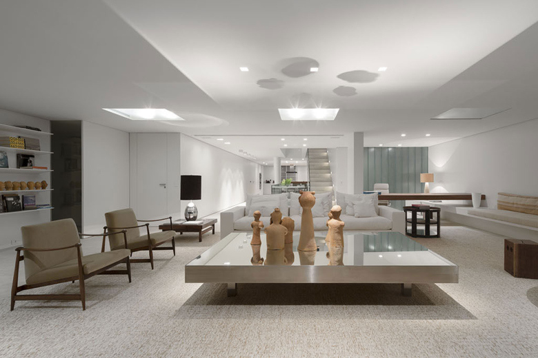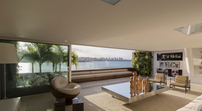 Le premier étage abrite trois chambres avec la cuisine alors qu’un flot de lumière naturelle permet de créer un chemin aidant à découvrir un paysage incroyable. Le deuxième niveau comprend l’entrée principale qui s’étend jusqu’à la salle de séjour disposant de trois ouvertures sur la piscine extérieure. Les portes vitrées coulissantes conduisent à l’une des terrasses dotée d’un immense canapé d’extérieur qui surplombe la magnifique baie de Guanabara.