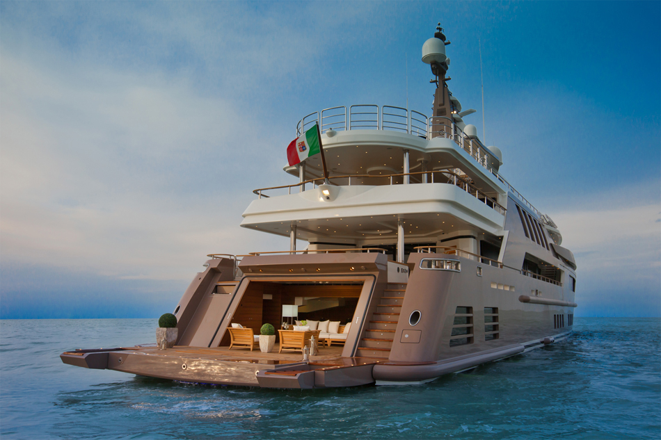 Présenté lors du dernier Monaco Yacht Show et finaliste du concours de design intérieur de ce même salon, ce yacht de 60 mètres nommé “J’ade” s’est fait remarquer par son garage flottant. Oui, un yacht avec garage. Véritable innovation, l’annexe (un Riva de 8 mètres tout de même !) peut se garer directement dans la coque du vaisseau mère par un accès latéral. La navigation n’en est à priori pas gênée, ce “garage” étant vidé en à peine 3 minutes !