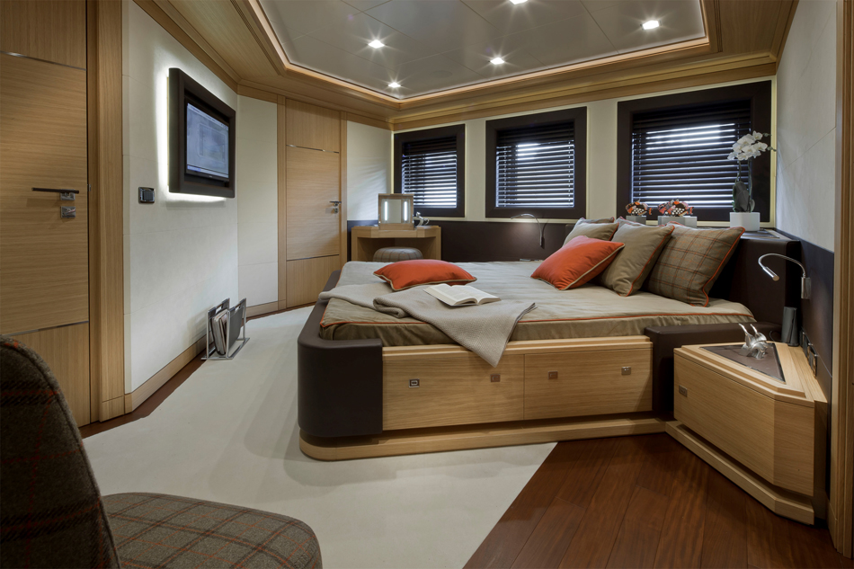 Voici un bateau que vous ne verrez nulle part ailleurs – et pour cause – il est de ce genre de barques qui sont basées sur un “chassis” existant mais personnalisées de fond en comble, ou de pont en cale plutôt. De plus, compte-tenu de sa taille (on dit souvent qu’à ce niveau là on compte plus d’un million d’euros par mètre) et donc de son prix, il ne s’adresse qu’à une infime partie du genre humain, les ultra-riches.