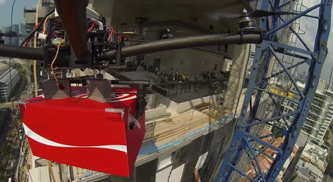 Coca-Cola utilise des drônes pour livrer des Care Packages aux travailleurs des buildings (Skyscrapers) en construction à Singapour.