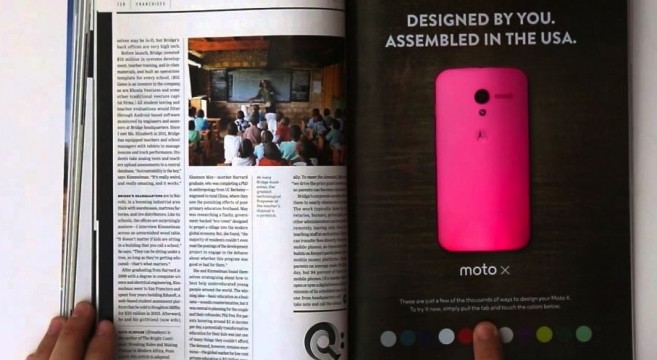 En janvier, dans les contrées de New-York et Chicago, le numéro de Wired accueille une page de publicité interactive. Grâce à un procédé « Video In Print », les lecteurs pourront changer la couleur du Moto X en cliquant simplement sur la couleur désirée comme le propose le site internet du Moto X. Le secret ? Très simple. Une série de LED intégrées dans la feuille qui change la couleur du smartphone. Une expérience user assez incroyable