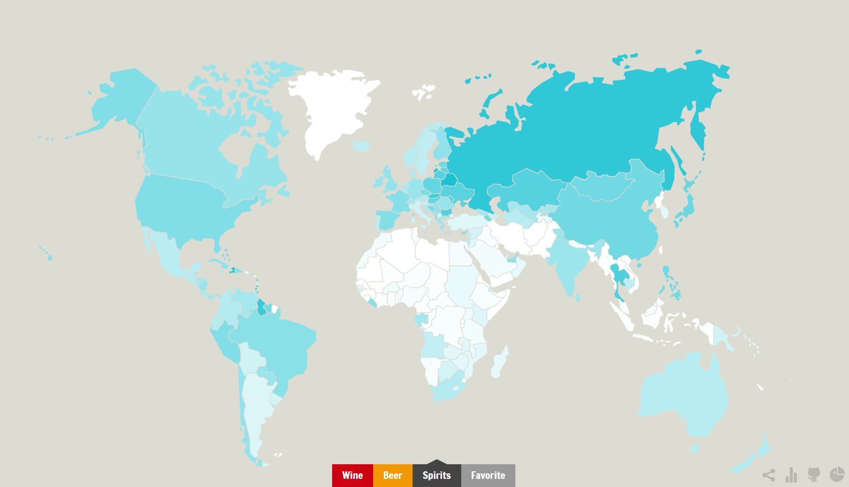 Ghostinthedata.com s’est intéressé à la consommation d’alcool à travers le monde (alcoholmap) ! Ils se sont posés une question simple : Quelle est la quantité et le type d’alcool bu dans le monde au cours d’une semaine ? Qui a la plus forte consommation d’alcool ? Une carte du monde et un curseur c’est tout ce qu’il vous faudra pour analyser les différences entre pays. Passez tout simplement le curseur de votre souris sur un pays ou utilisez les boutons pour afficher dynamiquement l’état de la consommation d’alcool dans le ou les pays. Vous aurez ainsi une vision claire et précise de la consommation d’alcool (vins, bières et spiritueux) de chaque pays. Les données proviennent de l’OMS (Organisation Mondiale de la Santé) alors c’est assez sérieux comme étude…