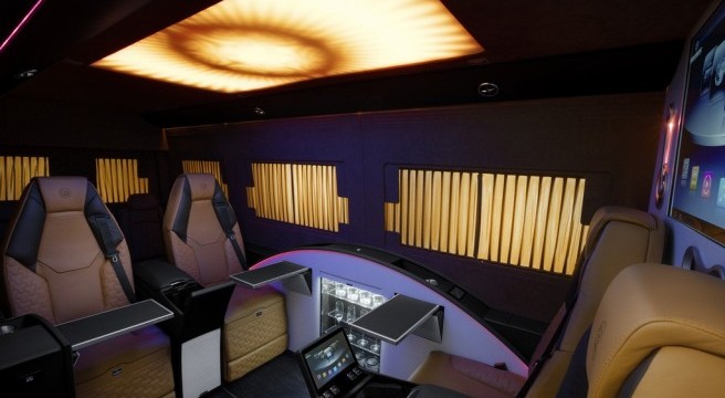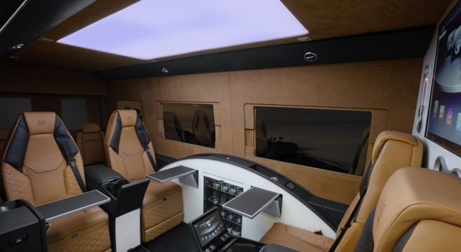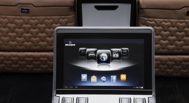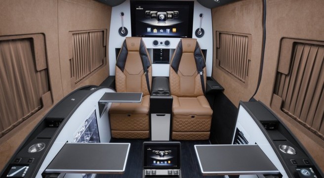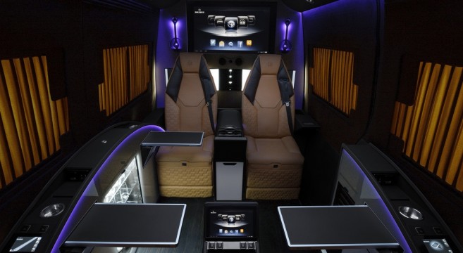 Tous les éléments de l’intérieur ont été entièrement revus, n’épargnant aucune dépense. Brabus Sprinter – Business Lounge Edition dispose de quatre sièges type “affaires” pour les conférences, une troisième rangée supplémentaire de sièges (jusqu’à huit au total). Les sièges inclinables, chauffants ont même une fonction massage intégrée. Il y a huit rideaux motorisés qui traversent le “Business Lounge” pour offrir une plus grande intimité à ses voyageurs VIP, avec en plus un concept de communication innovant qui permet à l’homme d’affaires, une fois à bord, d’avoir la possibilité de synchroniser leurs ordinateurs portables ou tablettes avec le mediacenter spécialement conçu par Brabus, l’affichage de leur contenu s’effectuant sur l’écran LCD Full HD de 42 pouces monté derrière la cabine du conducteur.