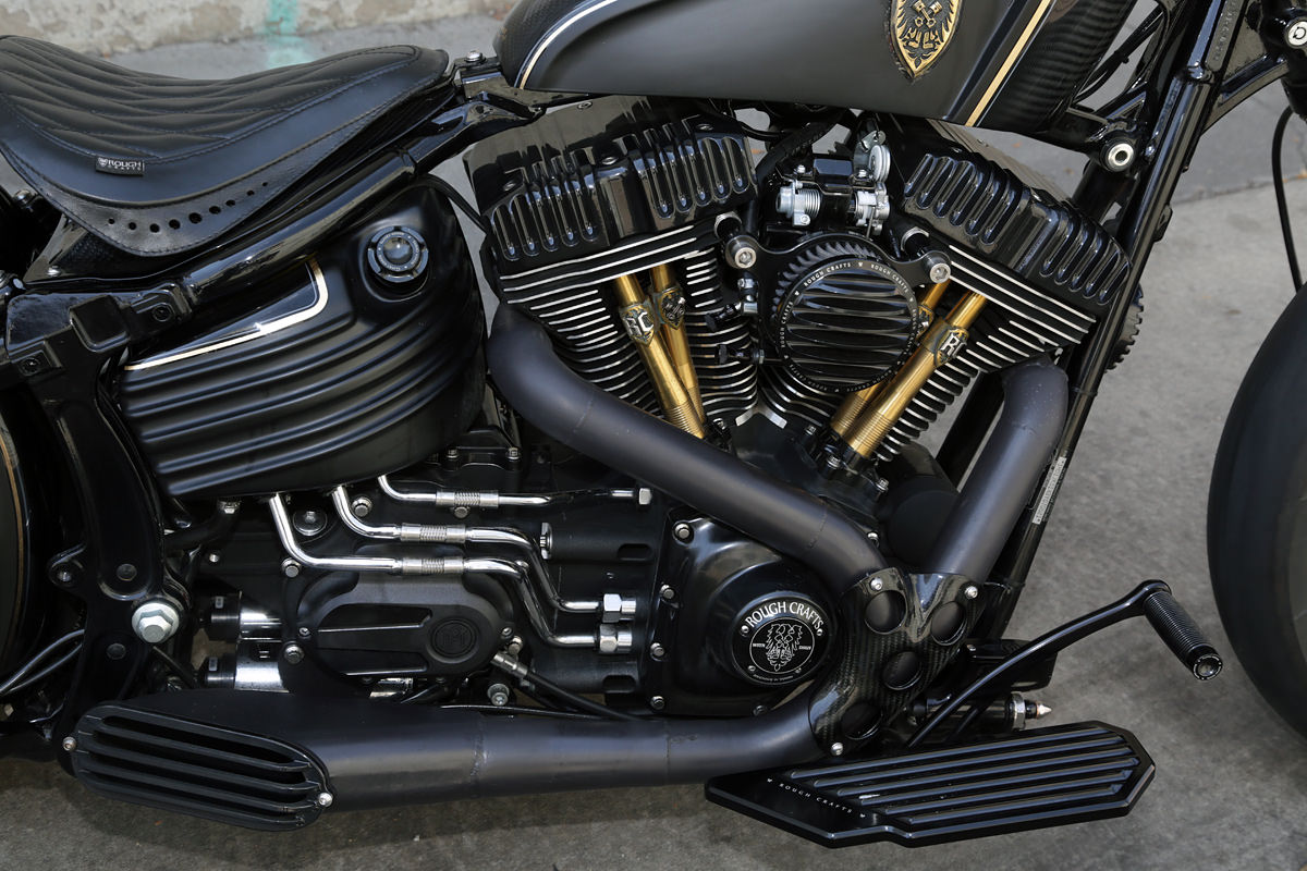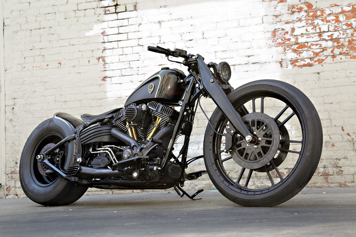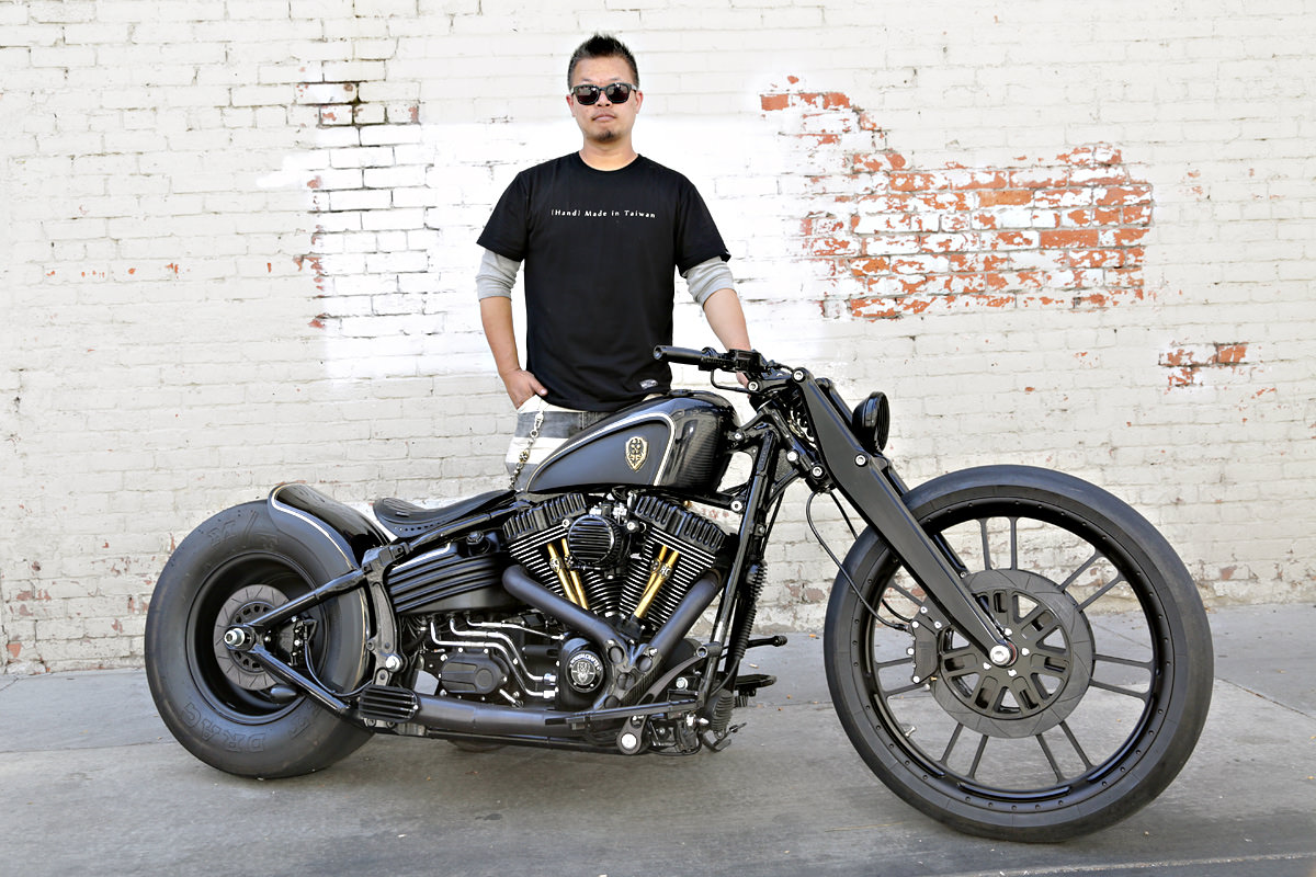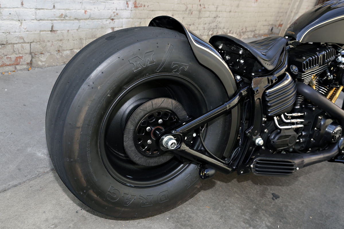 Après deux années de réflexion à ce sujet, Winston Yeh a mis la main sur une 2009-spec FXCWC Softail Rocker C et se mit enfin au travail. La Rocker n’a jamais été un modèle de réussite dans l’univers des passionnés de Harley. Cependant c’est exactement ce que Winston recherchait pour son projet de Dark Cannon. Après l’installation du bras avant, il a monté un pneu 23 pouces Roland Sands Design Morris dans une finition “black ops”. Les dimensions de ce pneu sont absolument incroyables, c’est du 15×7 ! Le pneu avant, quant à lui, a été fourni par Dunlop et ne vous attendez pas à le retrouver dans le commerce puisqu’il s’agit d’un prototype. Winston Leh a renforcé le freinage aux deux extrémités avec un étrier ISR à 4 pistons et rotors Lyndall. Il équipé la roue arrière d’une suspension progressive. Le système d’échappement et le filtre à air sont les deux parties qui sont l’oeuvre de Rough Crafts. Une transmission Baker DD7 envoie les chevaux à cette énorme roue arrière. Le travail sur cette Dark Cannon est tout simplement magnifique. Avec une bécane comme celle-ci, vous n’allez pas passer pour un rigolo dans la rue…