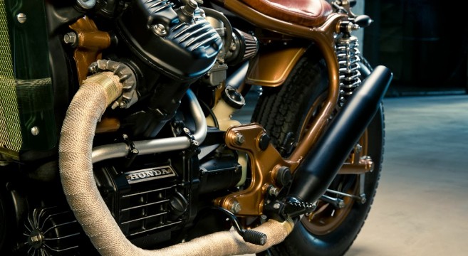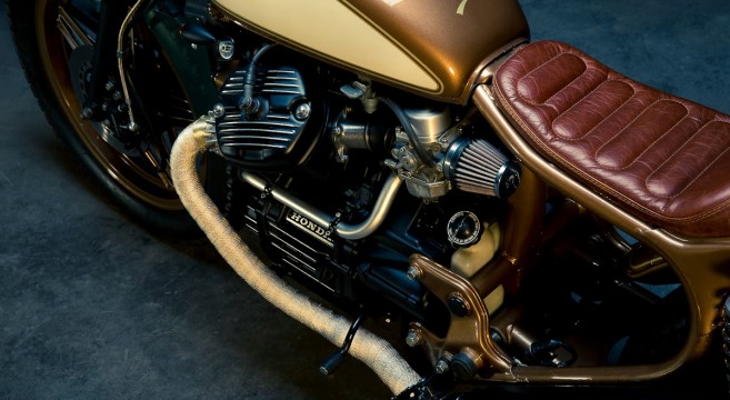 Dépouillée… Dirk Oehlerking a enlevé toutes les vis en place sur la version d’origine. Le moteur V-Twin transversal de la moto a reçu un revêtement thermo-sensible, tandis que le collecteur d’échappement est enveloppé avec du ruban adhésif thermique. Une selle confortable est faite entièrement à la main, tout comme la boîte abritant la batterie, les amortisseurs, le levier de frein à pied, et le carénage. Il y a un échappement initialement utilisé sur Harley Davidson ainsi qu’un repose-pieds provenant d’une Yamaha XT 600, un phare Bates avec un bouchon de Harley, et des pneus signés Avon. Le travail de peinture d’or est tout simplement la cerise sur le gâteau pour ce Honda CX500 Cafe Racer By Kingston Custom.