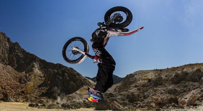 Après avoir ridé les plus grandes montagnes russes du Mexique, les rives de la Los Angeles River et après avoir parcouru des paysages lunaires en Grèce, le Lyonnais écrit une nouvelle page de l’histoire du trial avec cette traversée et ce backflip incroyables à l’intérieur du cratère du volcan!